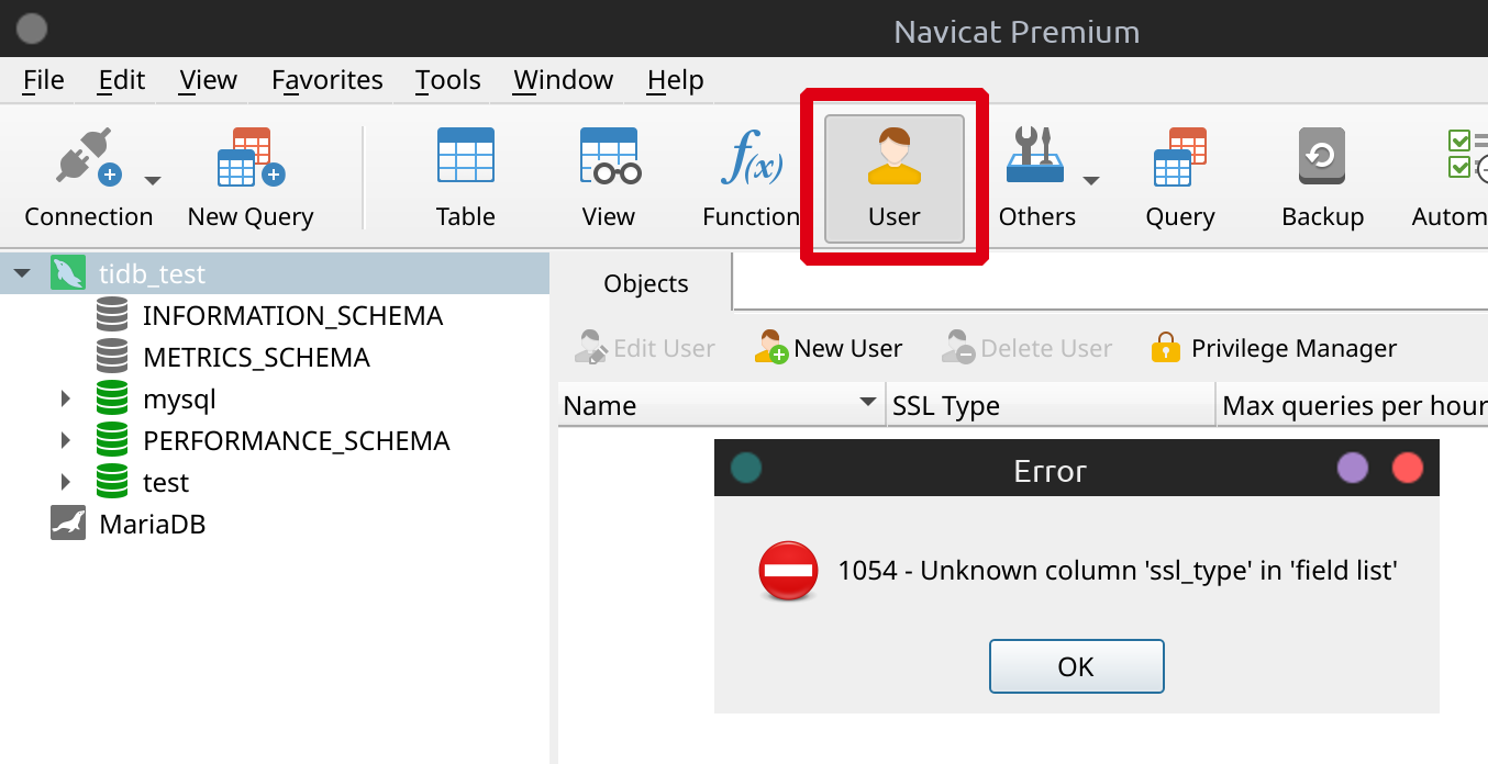 只要点击 “User” 按钮,Navicat 就会报一样的错误。