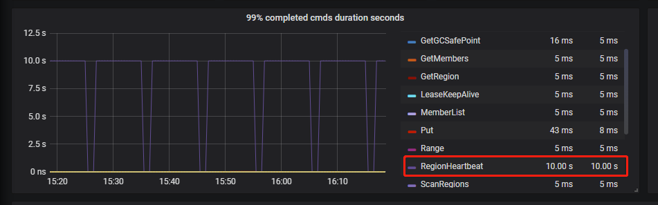 看起来这个图展示的是 pd 的 grpc 请求的 99% 耗时,新版本删掉了这个 RegionHeartbeat 指标,也许是因为当时确实搞错了,Hearbeat 即使是 10s 一次,也不该 duration 是 10s