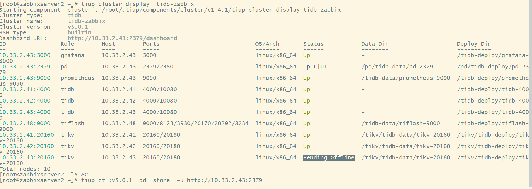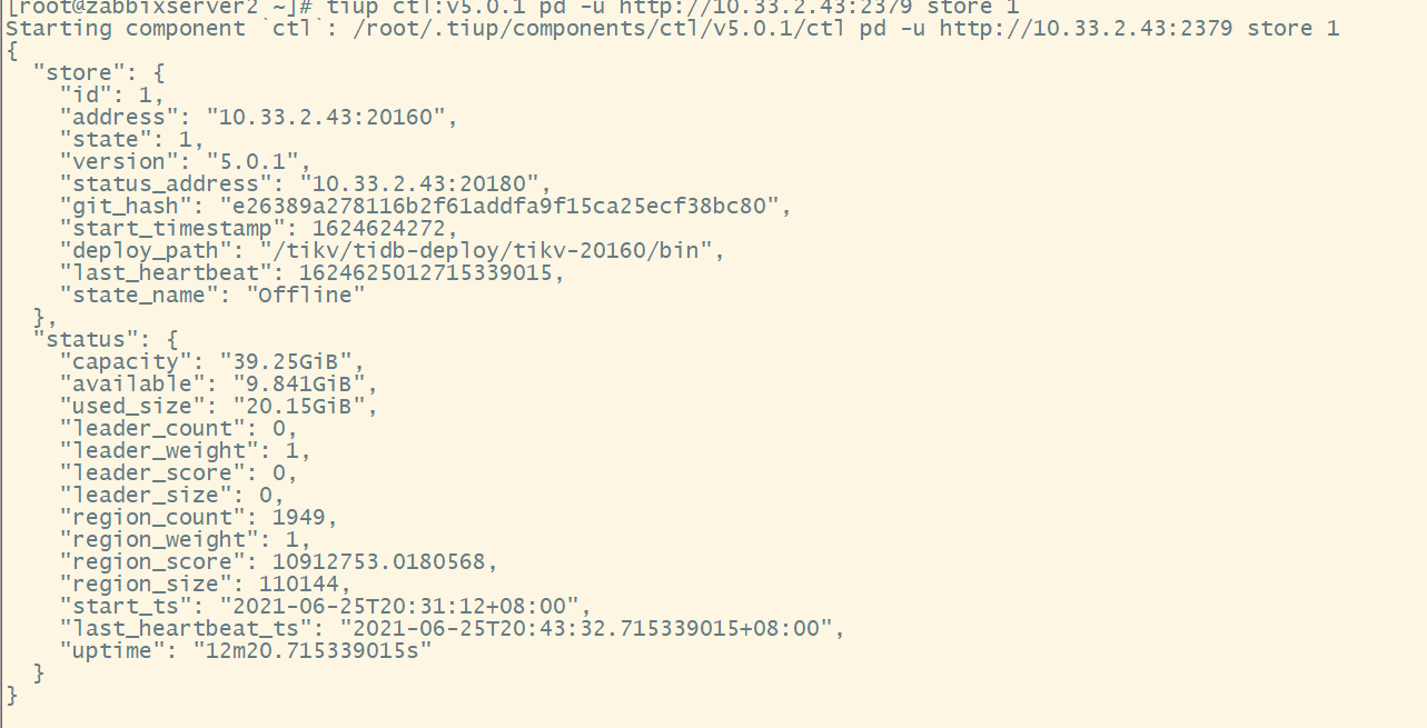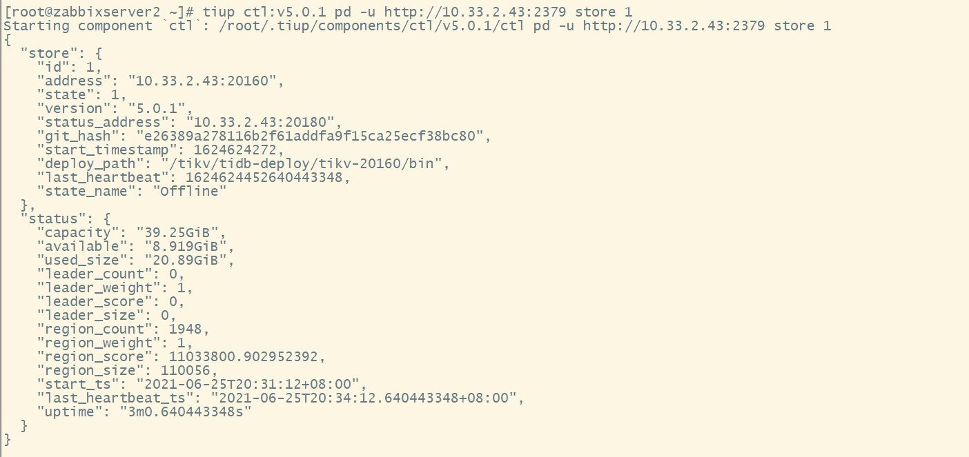 [root@zabbixserver2 ~]# tiup ctl:v5.0.1 pd store -u http://10.33.2.43:2379