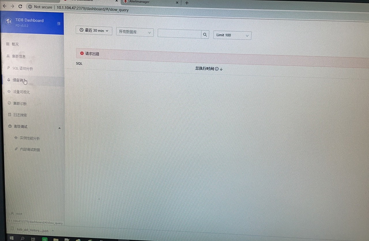 对tidbserver进行扩容操作时dashboard页面中的慢查询页面显示请求错误,把之前扩容的tidbserver停止或者缩容页面恢复正常
