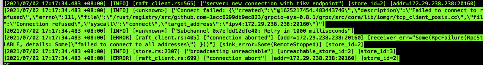 模拟故障的操作步骤为:(172.29.238.238:20160 节点)