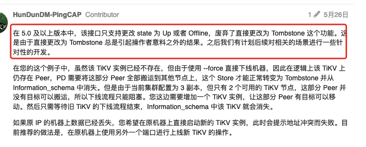已经过了一天后故障的tikv 节点一直是处于offline 的状态