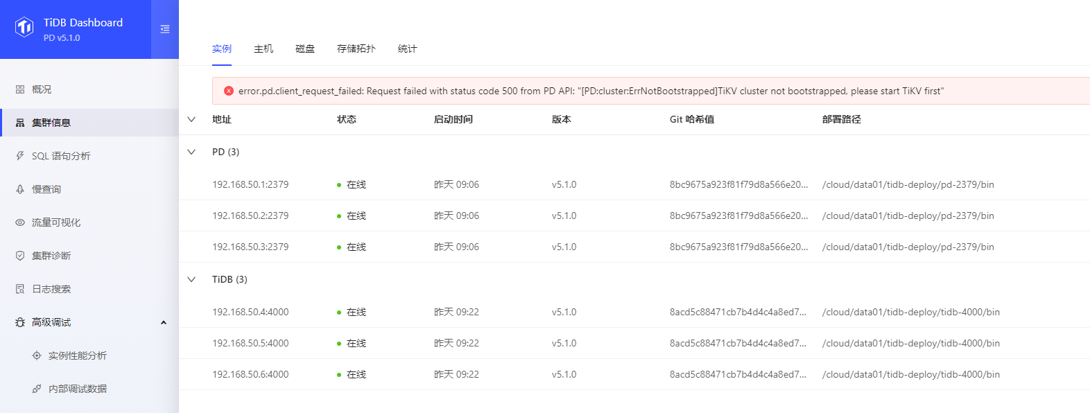 error.pd.client_request_failed: Request failed with status code 500 from PD API: “[PD:cluster:ErrNotBootstrapped]TiKV cluster not bootstrapped, please start TiKV first”