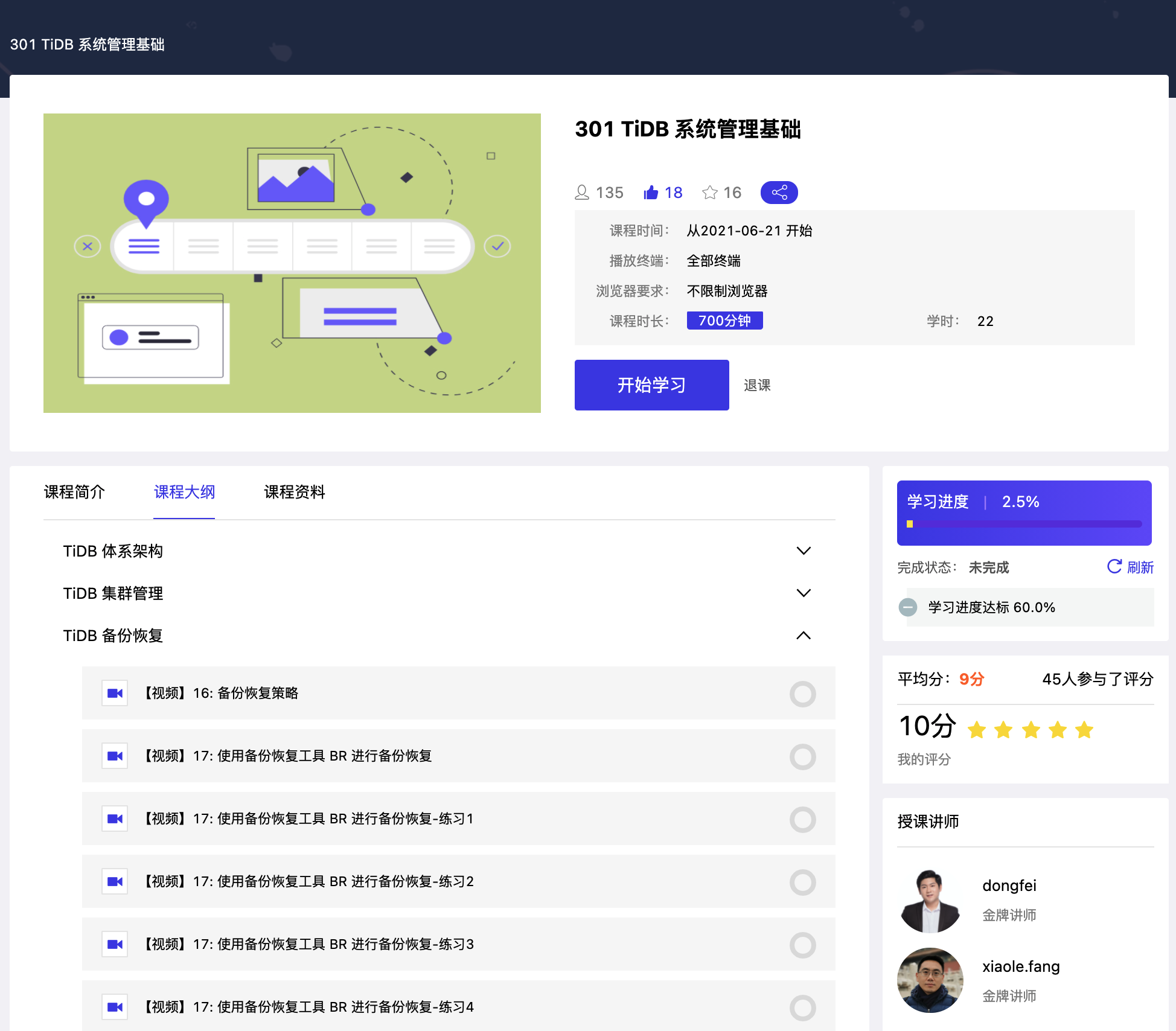 PingCAP Education 特约讲师、TUG 发起人房晓乐老师全新打造《TiDB 快速起步》课程,只需 2 个小时,带你全方位了解 TiDB 的由来、发展与演进,理解 TiDB 5.0 数据库的体系架构、技术创新、关键特性、应用案例与适用场景。