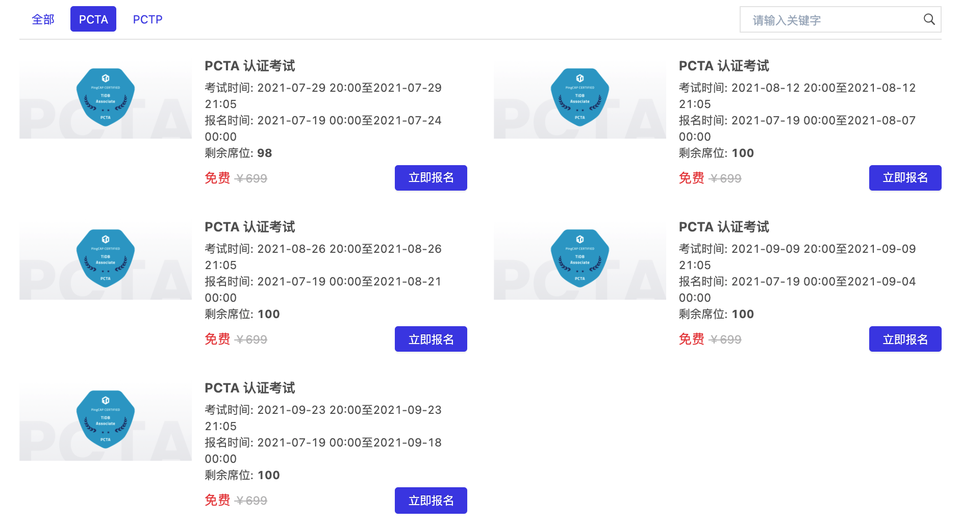 自 2021-7-29 日起,PCTA 5.0 考试季正式开启!线上考试 每 2 周开放 1 场 ,每场考试限额 100 人,成功报名的考生可获得: