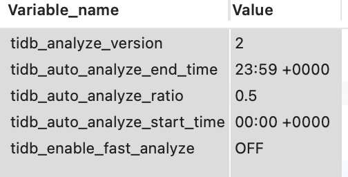 2、查询下当前自动收集统计信息的时间窗口 show variables like ‘%analyze%’