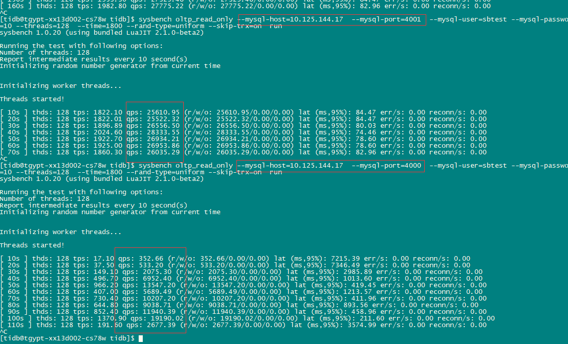 现在改用sysbench做测试,128线程 144.16:4000节点的tidb压测能到3万多QPS,而144.17:4000节点基本读在1W以下
