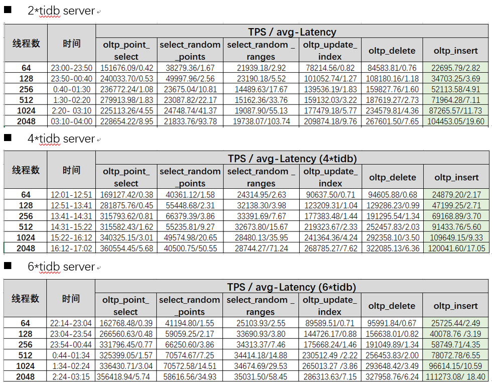 | sysbench | tidb v5.1.0(12个SSD,三副本) | oltp_read_write | 143207.04 | 7160.36 | 158.78 | 768(256x3) |