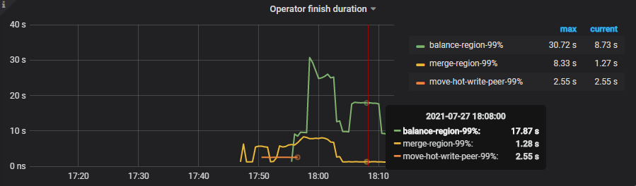 可以看到系统存在大量的空 region,此时我们需要开启 Region merge ,通过调度把相邻的小 Region 进行合并。开启后,PD 在后台遍历,发现连续的小 Region 后发起调度。