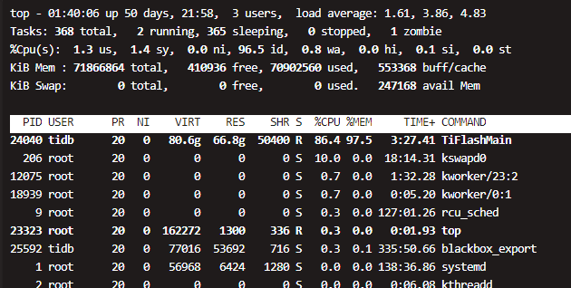 生产节点,tiflash 挂掉一台, 重启不来,tiflash 72G 内存,查看监控发现内存暴涨,直到OOM,再次重启,无限循环,加了两个内存限制60G,还是不管用,一样OOM