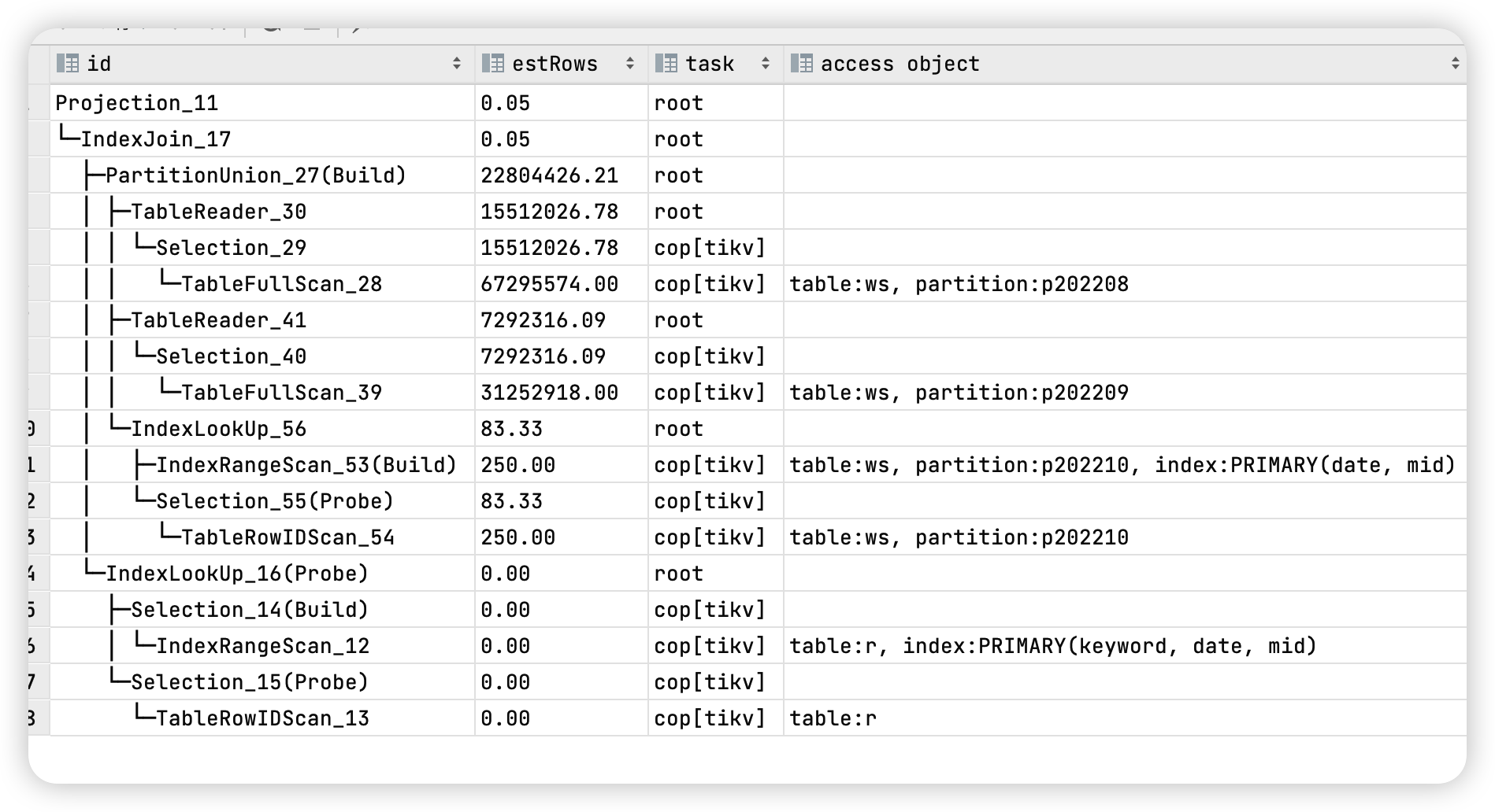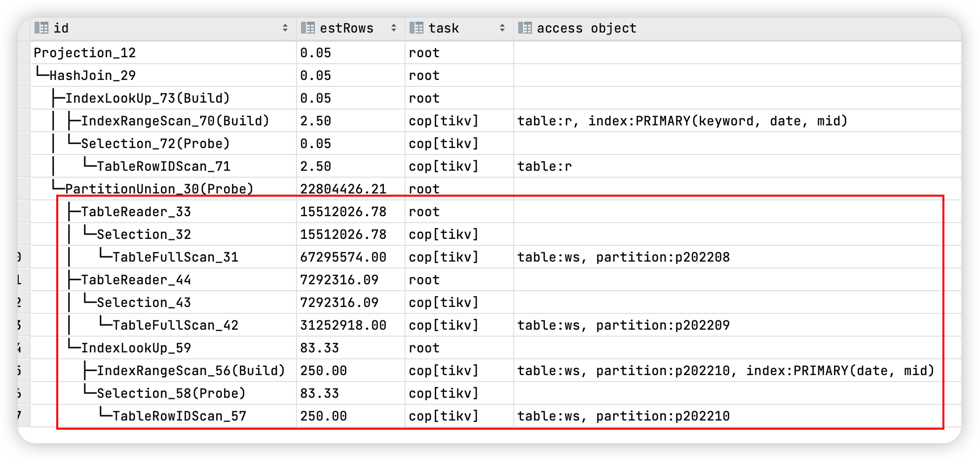 加了use index的hint之后还是那样,不仅驱动表的顺序没变,连ws表的查询有两个分区也还是走的全表扫描