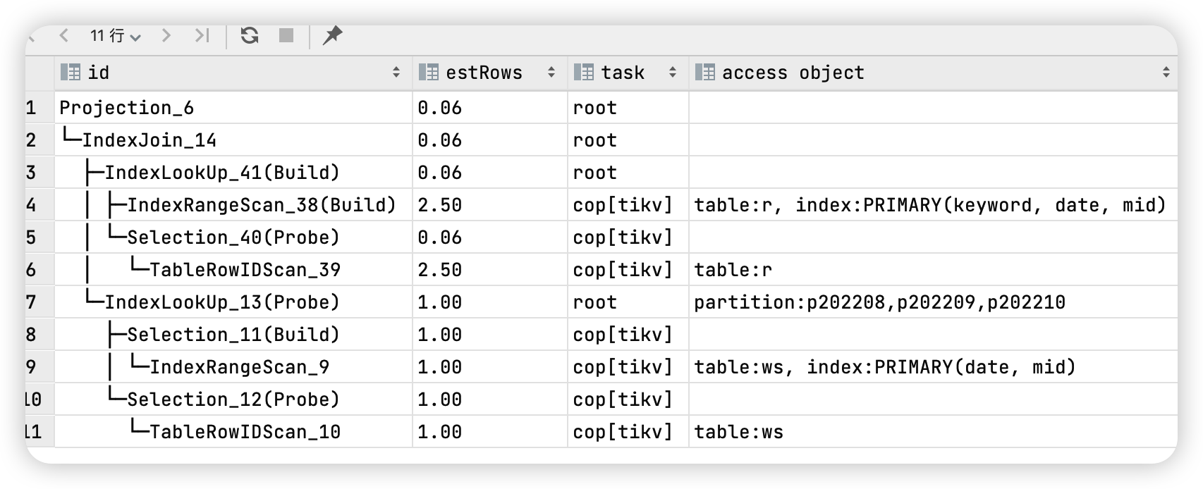 你的另一个帖子上是动态裁剪后全表扫描或其他情况下大量的cop请求发送到tiflash造成的积压,先这个环境是那个版本升级吗? 看你现在的执行计划里走的都是tikv可以试试开启动态裁剪后,加/read_from_storage(tikv[xx])/方式强制走tikv,避免走tiflash。 不开动态裁剪的话,表关联时不能识别到关联条件值而做分区裁剪。