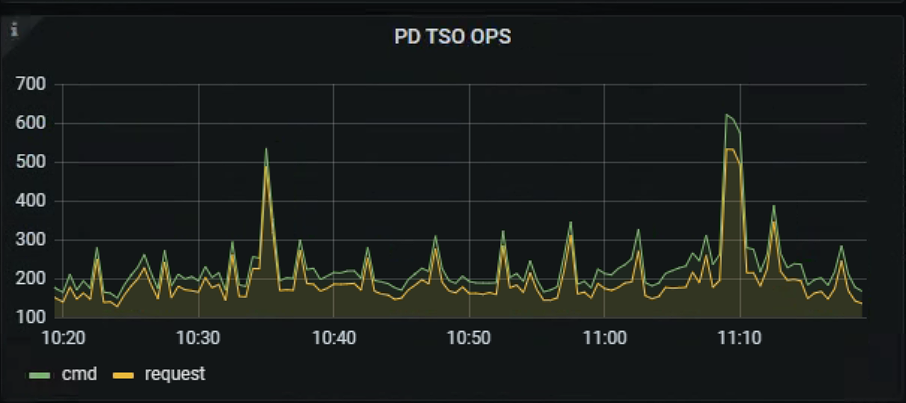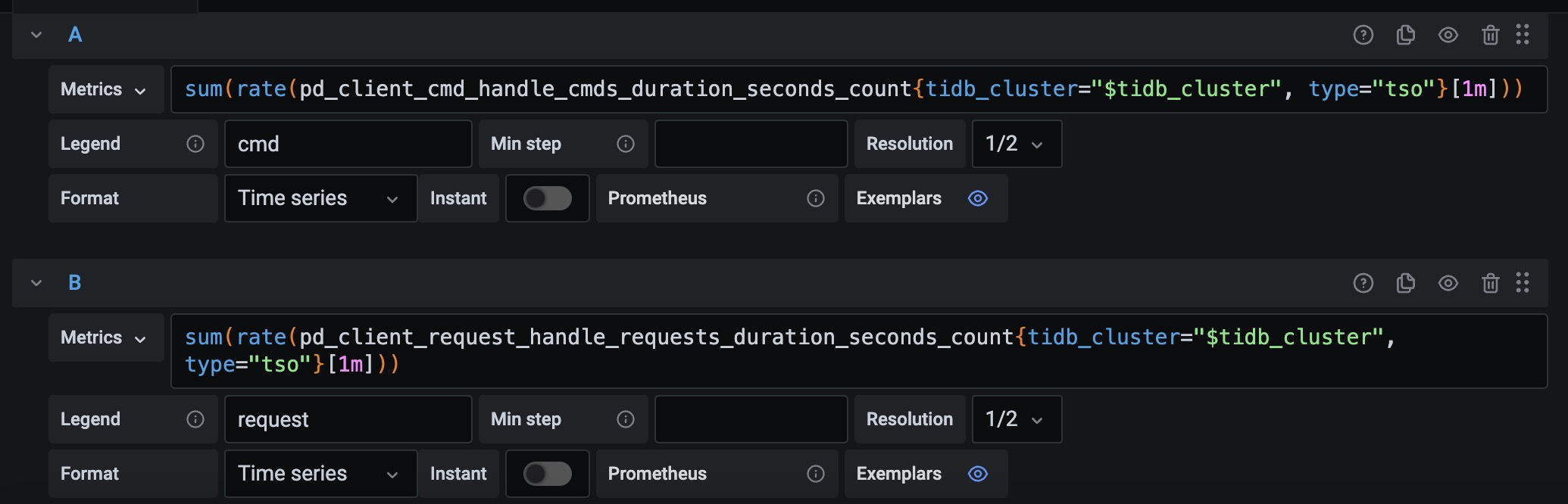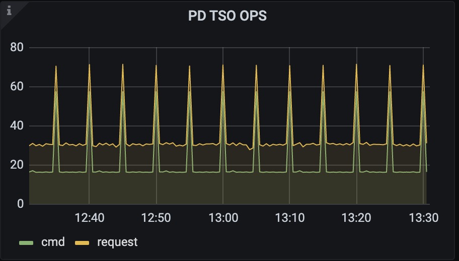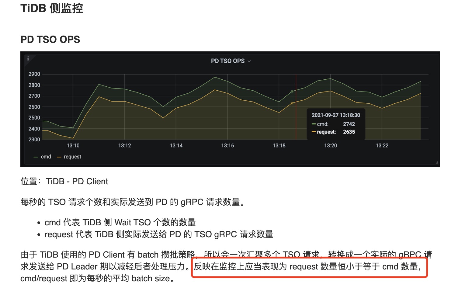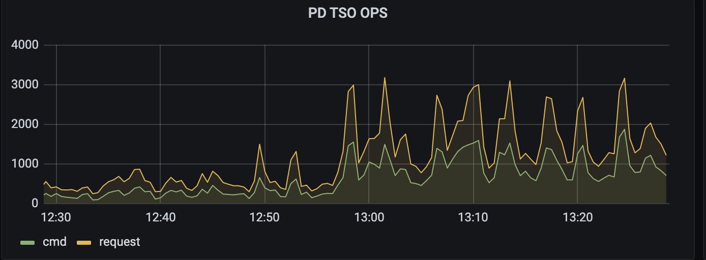 最近突然发现的一个很奇怪的现象,在 tidb 监控面板中,pd tso request监控图,request值恒大与 cmd的值,按照 TSO 慢排查手册中的图以及说法,是 request 恒小于 cmd 才对,