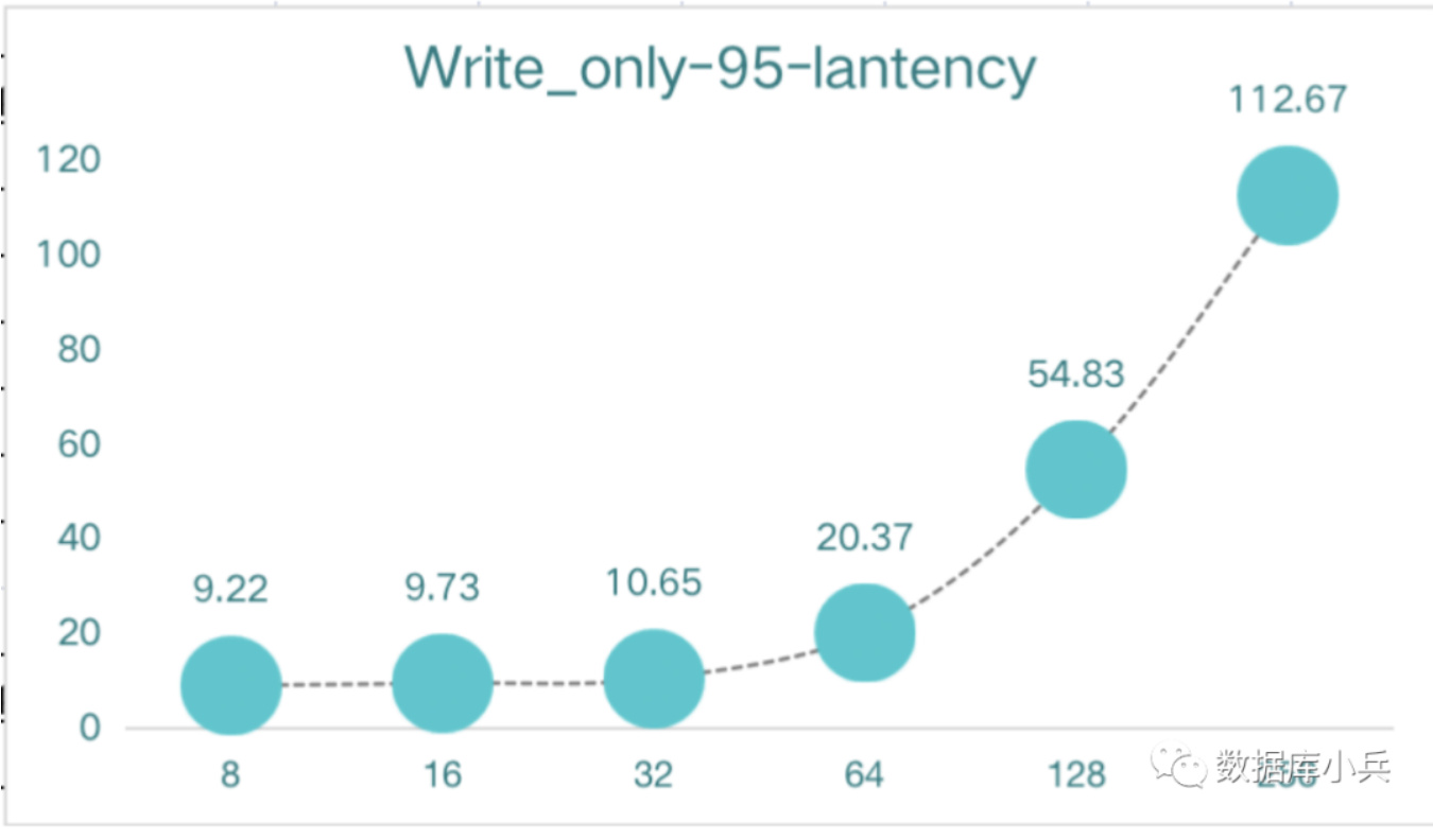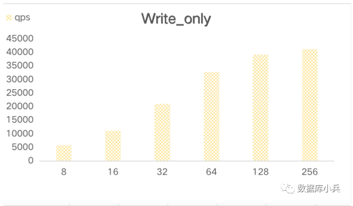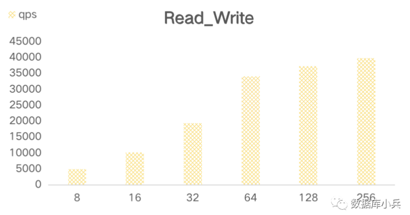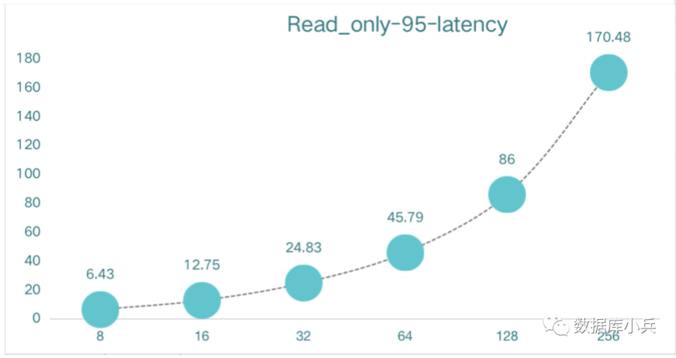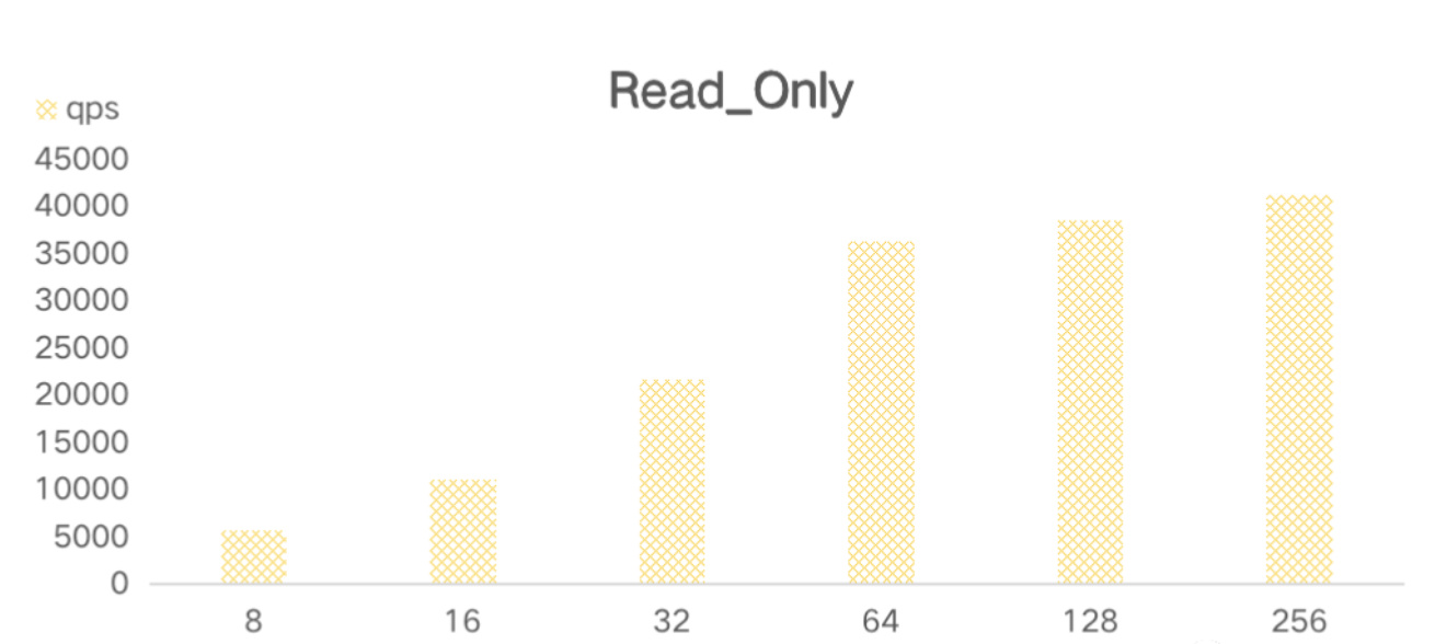 随着压测线程增加,只读qps 基本维持在35000-40000/s,延时在64线程之后明显提升,最大耗时在193ms,8-64线程压测延时也在30多ms