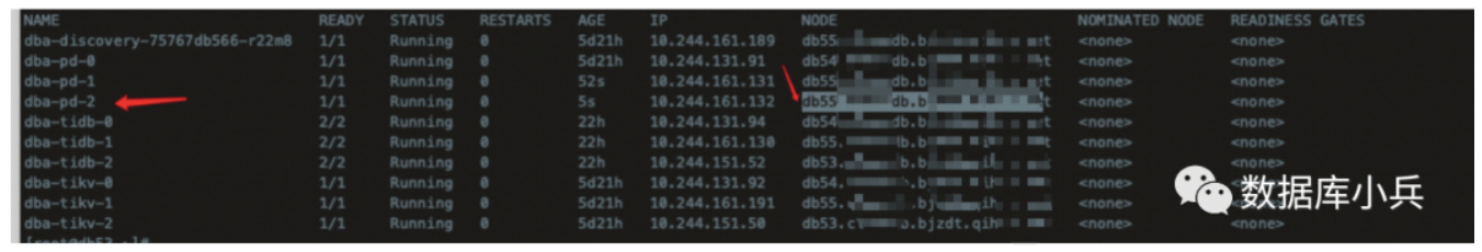 扩容一个pd,发现不会在db53分配新的pod了,db55 分配了2个,当然这是模拟,同一node 不建议存在两个相同集群角色