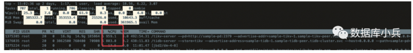 Tidb cpu 限制最大使用8c,tikv 限制cpu 最大10c,并发线程128进行压测,top 查看确实限制住了