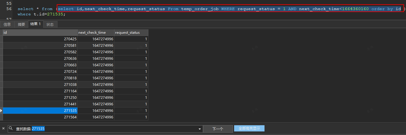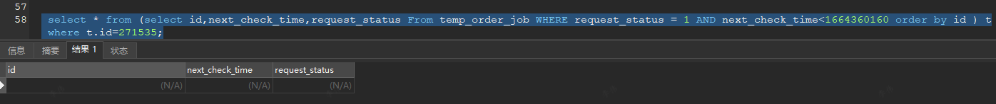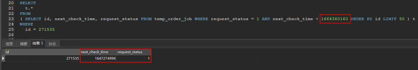 select * from (select id,next_check_time,request_status From temp_order_job WHERE request_status = 1 AND next_check_time<1664360160 order by id ) t where t.id=271535;