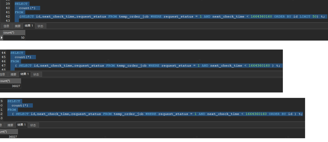 select count(*) from (select id,next_check_time,request_status From temp_order_job WHERE request_status = 1 AND next_check_time<1664360160 order by id );