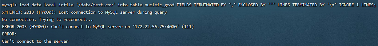 我想向tidb中导入csv文件,运行命令经过大约20分钟以后,报错:连接丢失