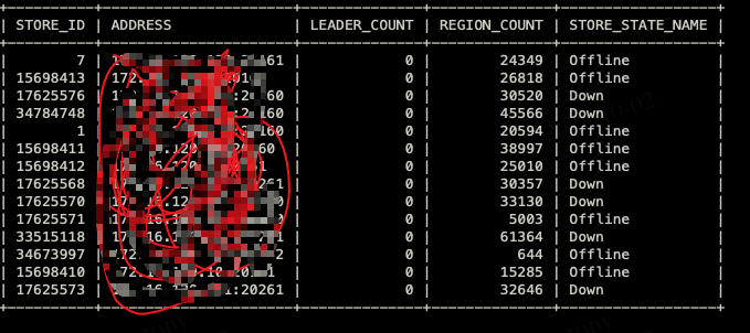 我是根据这个找到我们所有挂掉的store id。/data/tools/tidb-community-server-v5.2.2-linux-amd64/pd-ctl region --jq=’.regions[] | {id: .id, peer_stores: [.peers[].store_id] |
