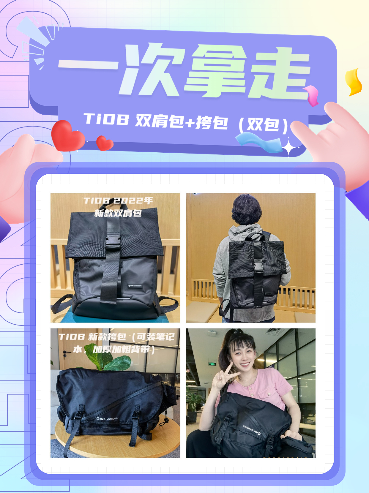 送出:TiDB 社区限量款(双肩包 + 挎包)双包奖励!