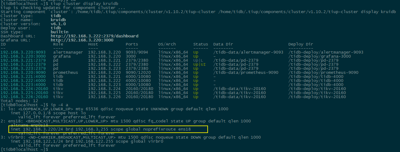 集群拓扑如下(192.168.3.220是中控主机,部署tiup、TiUniManager、br等组件),以上有关TiUniManager 的部署命令也都是在192.168.3.220中控主机中执行:
