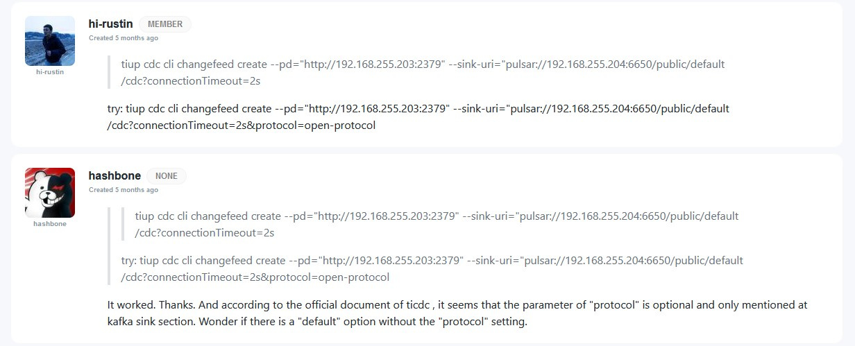 [CDC:ErrKafkaInvalidConfig]kafka config invalid: [CDC:ErrMQSinkUnknownProtocol]unknown ‘’ protocol for Message Queue sink