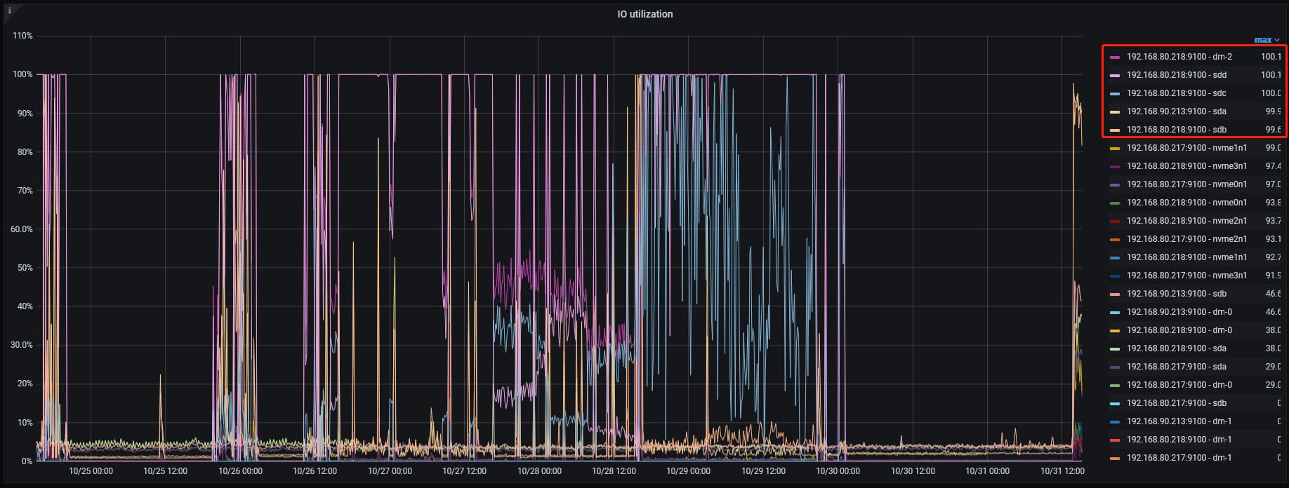 192.168.90.213 的sda和192.168.80.218 的sdb是hdd机械盘,因为ssd盘符不够,将他两作为tikv节点使用了,也跑到99.9了,其他的盘符是ssd,跑的也比较高 都是90以上了,我是混合部署的,使用的默认配置,没有设置参数,是不和