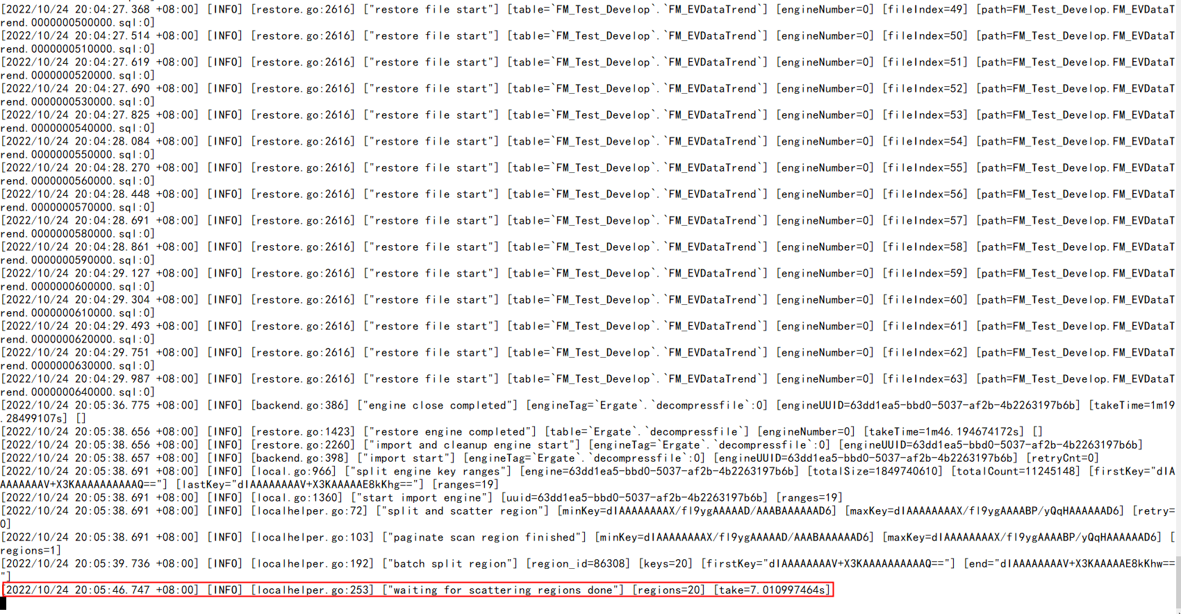 看上去 split 和 scatter 都已经完成了。下面应该是在 import kv 到 tikv。