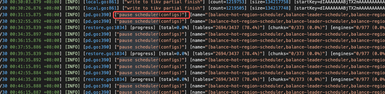 查看发现导入的集群空 region很多,将max-merge-region-keys max-merge-region-size调整后,lightning进程过一段时间就会触发pause 调度,空 region 数下降就会停止,再次查看该配置发现配置的参数就被清为0;