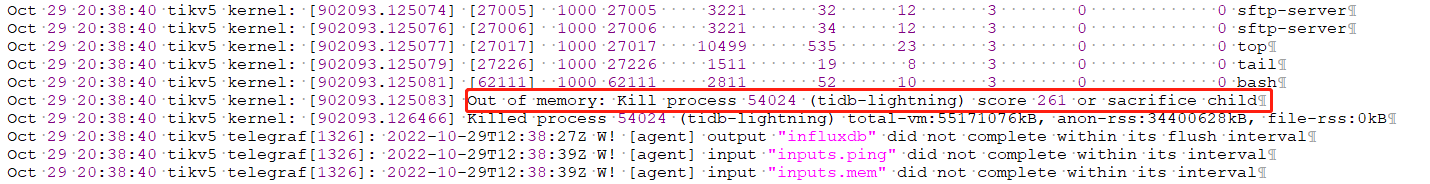 2.查看了下游服务器/var/log/message日志,确实是tikv OOM了,