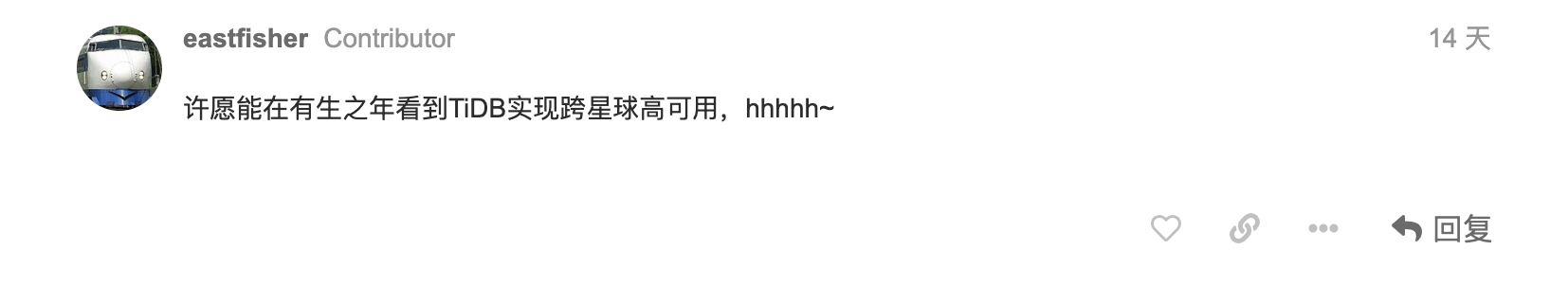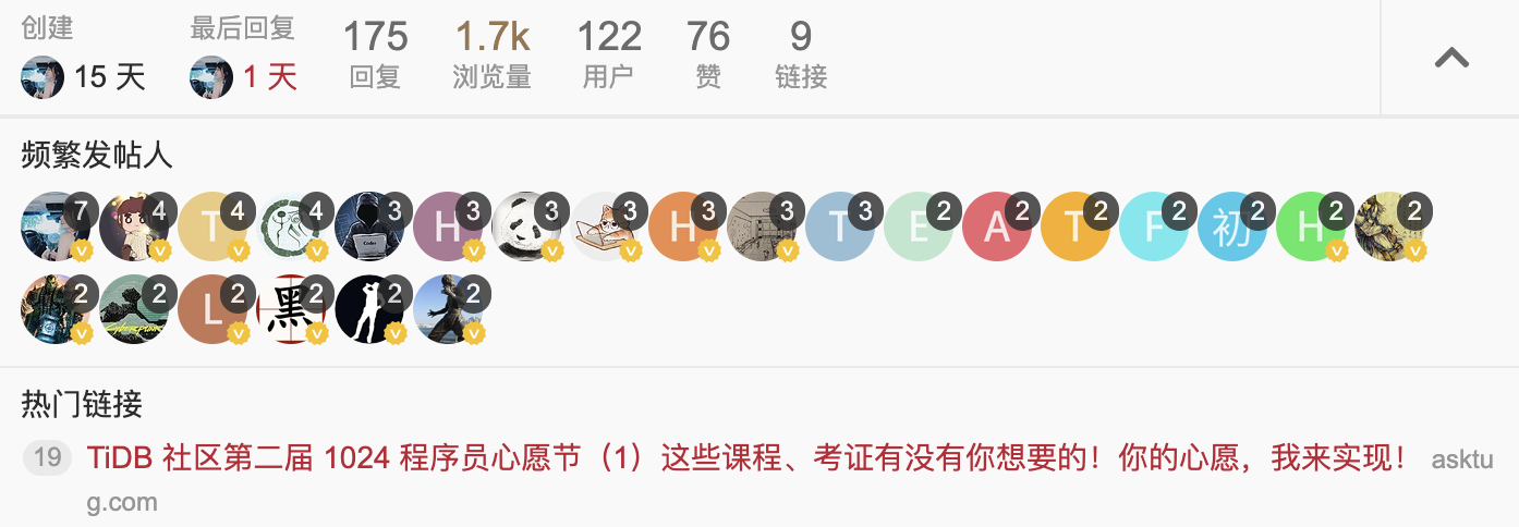 @caiyfc @xingzhenxiang @wakaka @Ming @OnTheRoad @ShawnYan @forever @TiDBer_Kylin @kavenab @tidb狂热爱好者 @gary @半瓶醋仙 @_张建国 @张雨齐0720 @数据小黑 @TiDBer_Lw @zhouzeru @TiDBer_u9dEAZ3L @小小橙兜 @TiDBer_Wp @alfred @ddhe9527 @cs58_dba @onlyacat @huazai0803 @db_user @hey-hoho @xiaohetao @啦啦啦啦啦 @Hacker007 @Raymond @danghuagood @逍遥_猫 @kooooooooo @wuxiangdong @天蓝色的小九 @bingchen @Kongdom @edward-大辰 @tracy0984 @DBAhank @xfworld @Tank001 @比特鱼-54 @ti-tiger @梦想是个厨子 @meathill @ealam_小羽 @望海崖2084 @CuteRay @Soysauce520 @wisdom @buddyyuan @TiDBer-s @孙晨航11 @fanruinet @Myth @dengqee @BraveChen @木木三DB @Liuhaoao @Kuber @coderv @neolithic @wfxxh @chengye233 @查拉图斯特拉说 @Hacker_小峰 @irislips @dukewen @Yifei_Jia @TiDBer_Dw8Ac8p1 @Jiawei @Albertchamberlain @TiDBer_FtuEk0Z3 @边城元元 @notebook385 @itfarmer @我是咖啡哥 @TiDBer_dog @TiDBer_sao游 @Aaronz @HuGanghui @林先森cC @TiDBer_Anthony @TiDBer_姜伯约 @霸王龙的日常 @wluckdog @履霜知冰 @ZhaoQi99 @Chasing1020