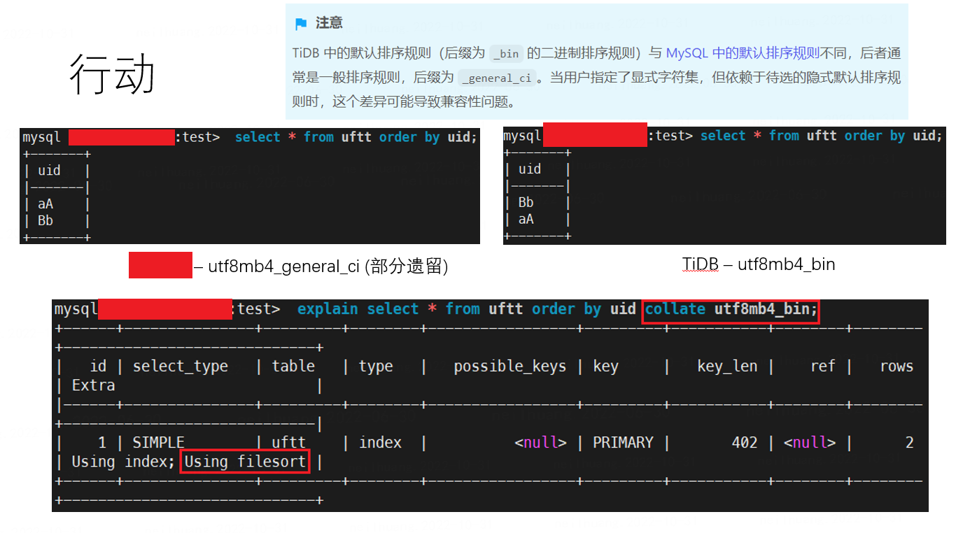 → 解释的有问题,“使用 sync-diff-inspector 数据校验,告知两个表的表结构不一致” 应该是报错确实指出这个 collation 的区别。绕过方法 collate 才应该是解决这个问题的方法。(第一处因果对应不上)