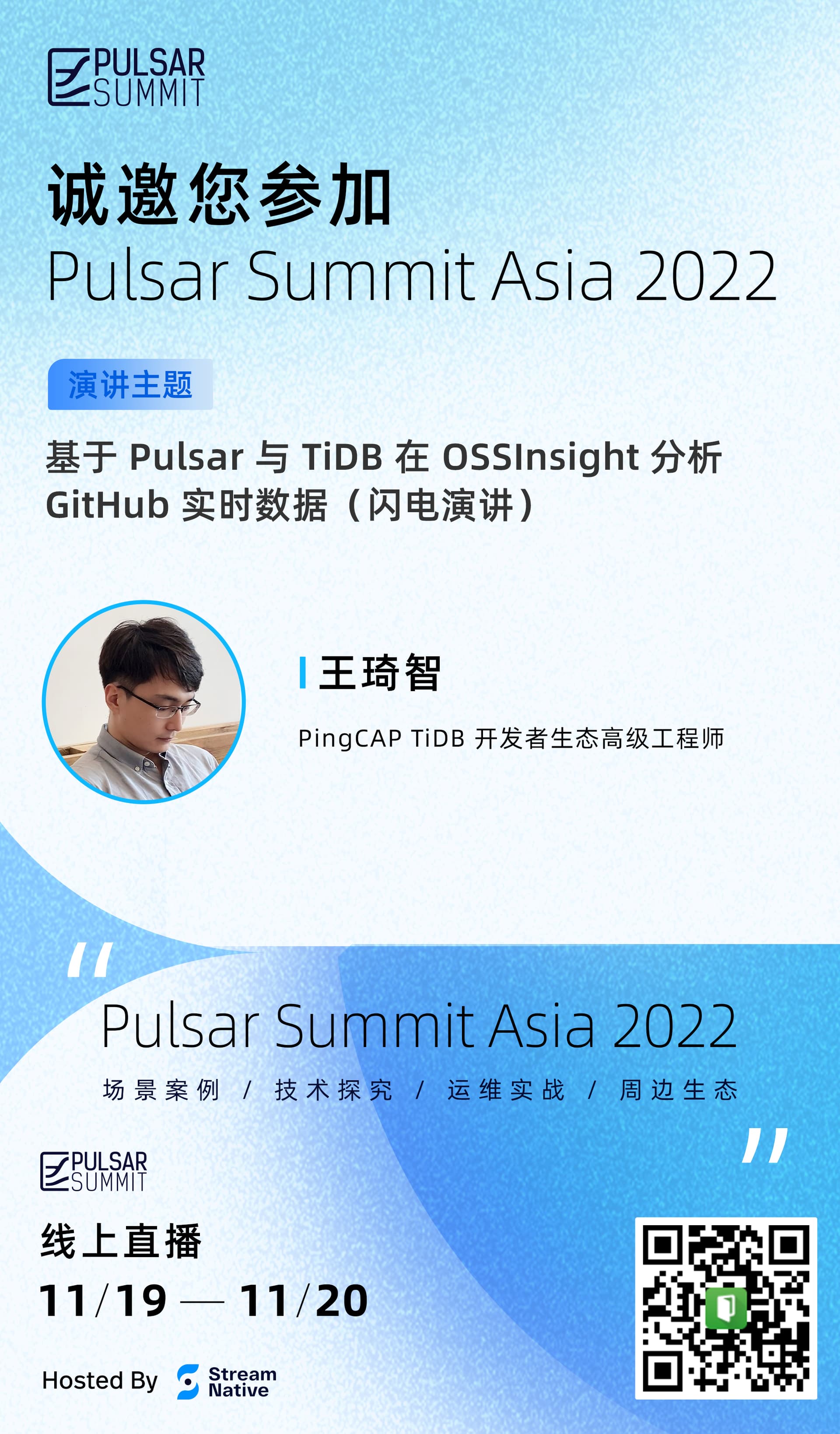 Pulsar Summit Aisa 2022,将于 11 月 19-20 日线上召开!更有 PingCAP TiDB 开发者生态高级工程师 王琦智带来《基于 Pulsar 与 TiDB 在 OSSInsight 分析 GitHub 实时数据》(闪电演讲)