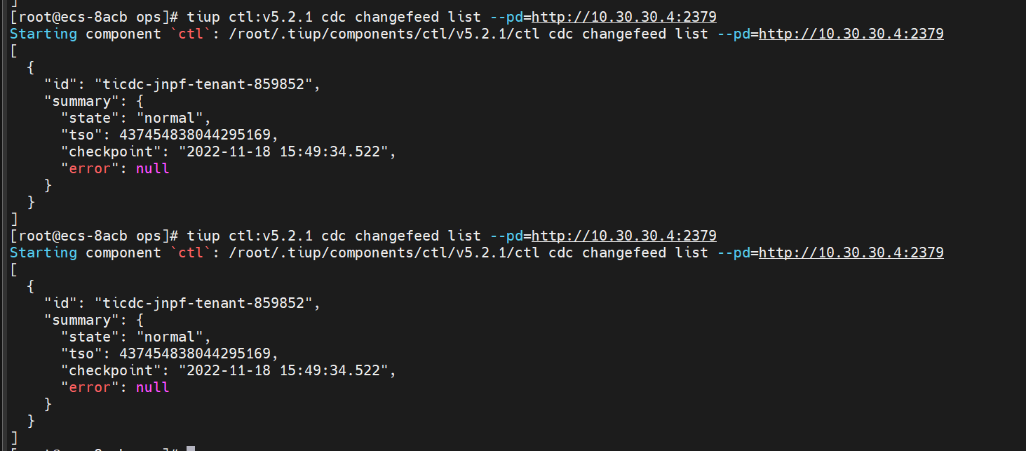 tiup ctl:v5.2.1 cdc changefeed list --pd=http://10.30.30.4:2379