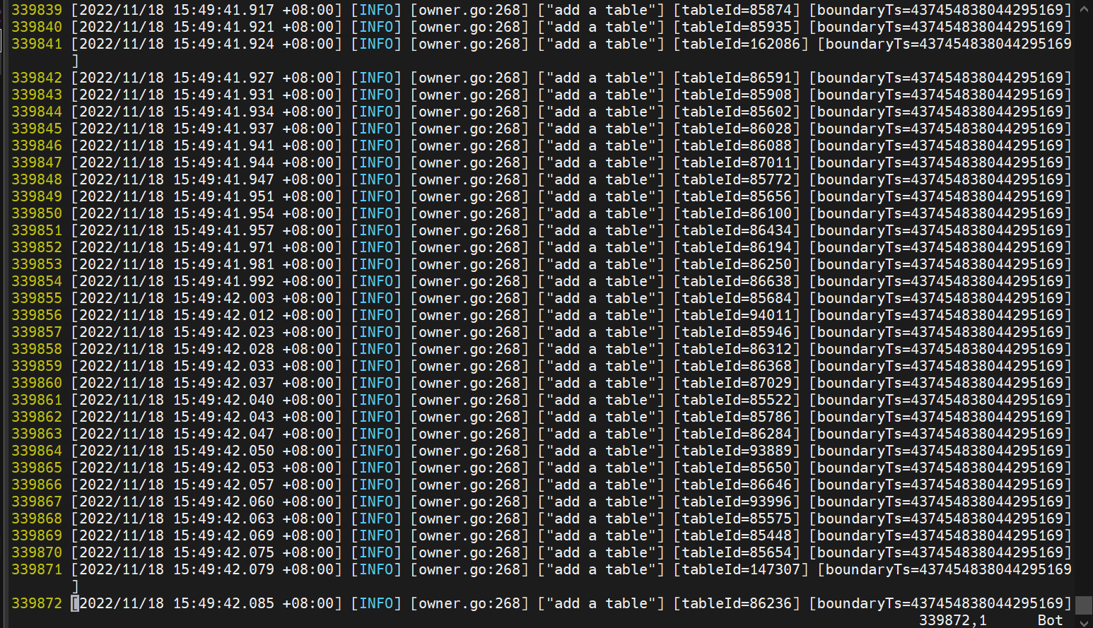 [2022/11/18 16:06:53.336 +08:00] [INFO] [region_range_lock.go:218] [“range locked”] [lockID=67727] [regionID=1217751] [startKey=6d44444c4a6f6241ff64ff644964784c69ff7374ff0000000000ff000000f700000000ff0000006c00000000fb] [endKey=6d44444c4a6f6241ff64ff644964784c69ff7374ff0000000000ff000000f700000000ff0000006d00000000fb] [checkpointTs=437455110267731969]