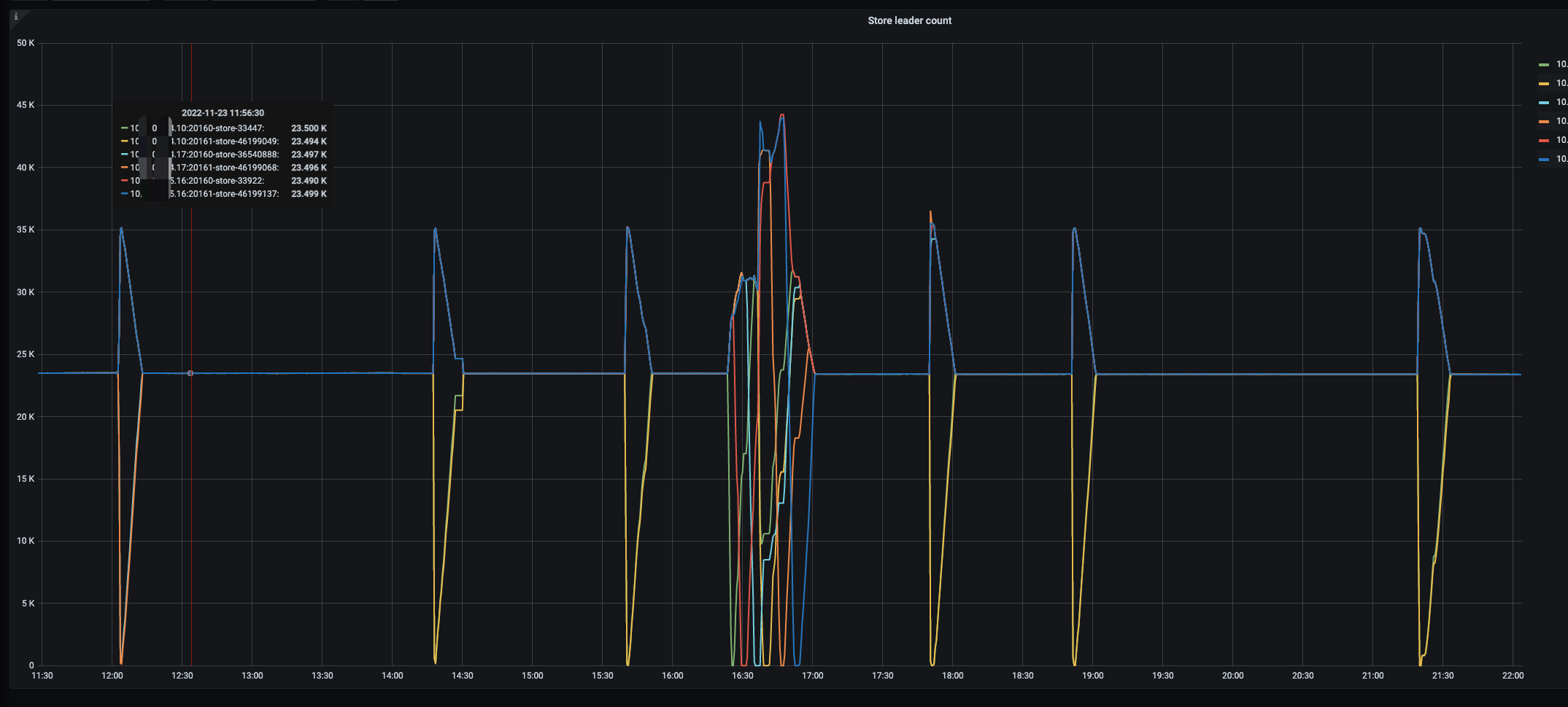 上述截图中间的图,交替数量变换,是在reload tikv 节点,可以忽略,观察左右的三个leader 跌0 的时间