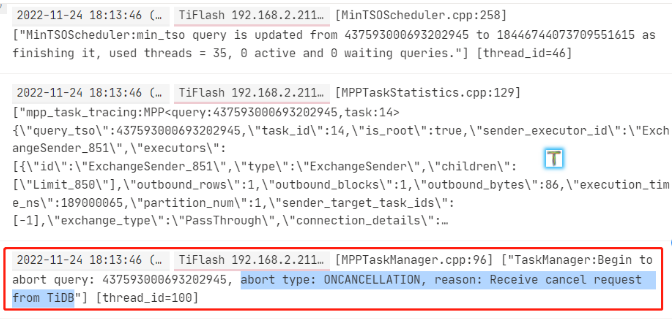 TiDB 发送了取消请求:TiDB 可能会发送取消请求来取消正在执行的查询。如果 TiFlash 收到了取消请求,就会返回该错误。这通常是由于查询超时或者用户手动取消查询导致的。