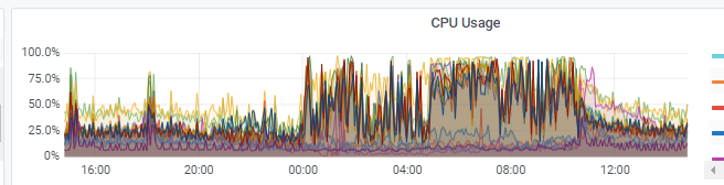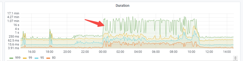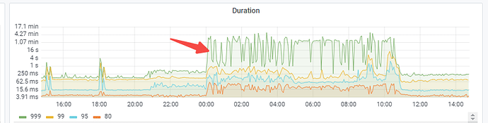 - 从grafana性能监控中发现,00开始P999延迟时间飙升到2m左右,tikv节点cpu利用率接近饱和,业务应用方最近没有新上线过(该业务应用上线几个月一直稳定运行)