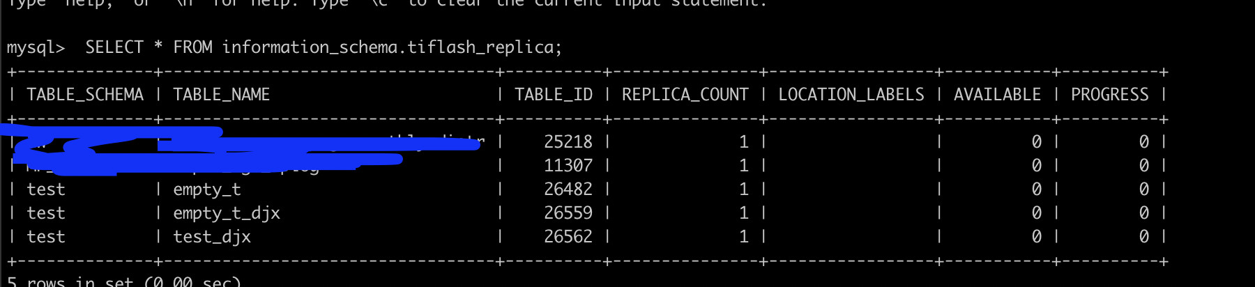 TiFlash AVAILABLE 和PROGRESS 均为0