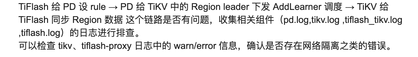 TiFlash 给 PD 设 rule → PD 给 TiKV 中的 Region leader 下发 AddLearner 调度 → TiKV 给 TiFlash 同步 Region 数据 这个链路是否有问题,收集相关组件(pd.log,tikv.log ,tiflash_tikv.log ,tiflash.log)的日志进行排查。
