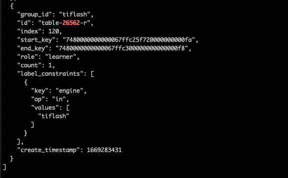 [2022/11/24 17:50:31.107 +08:00] [INFO] [rule_manager.go:244] [“placement rule updated”] [rule=“{"group_id":"tiflash","id":"table-26562-r","index":120,"start_key":"7480000000000067ffc25f720000000000fa","end_key":"7480000000000067ffc300000000000000f8","role":"learner","count":1,"label_constraints":[{"key":"engine","op":"in","values":["tiflash"]}],"create_timestamp":1669283431}”]
