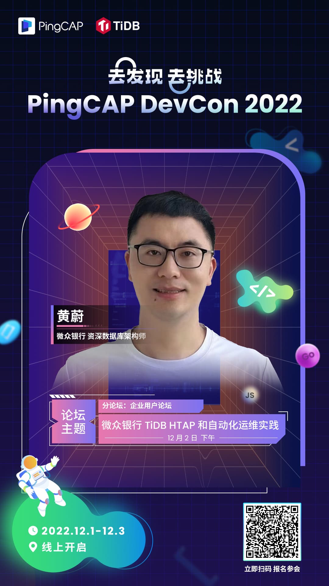 演讲主题 :微众银行 TiDB HTAP 和自动化运维实践