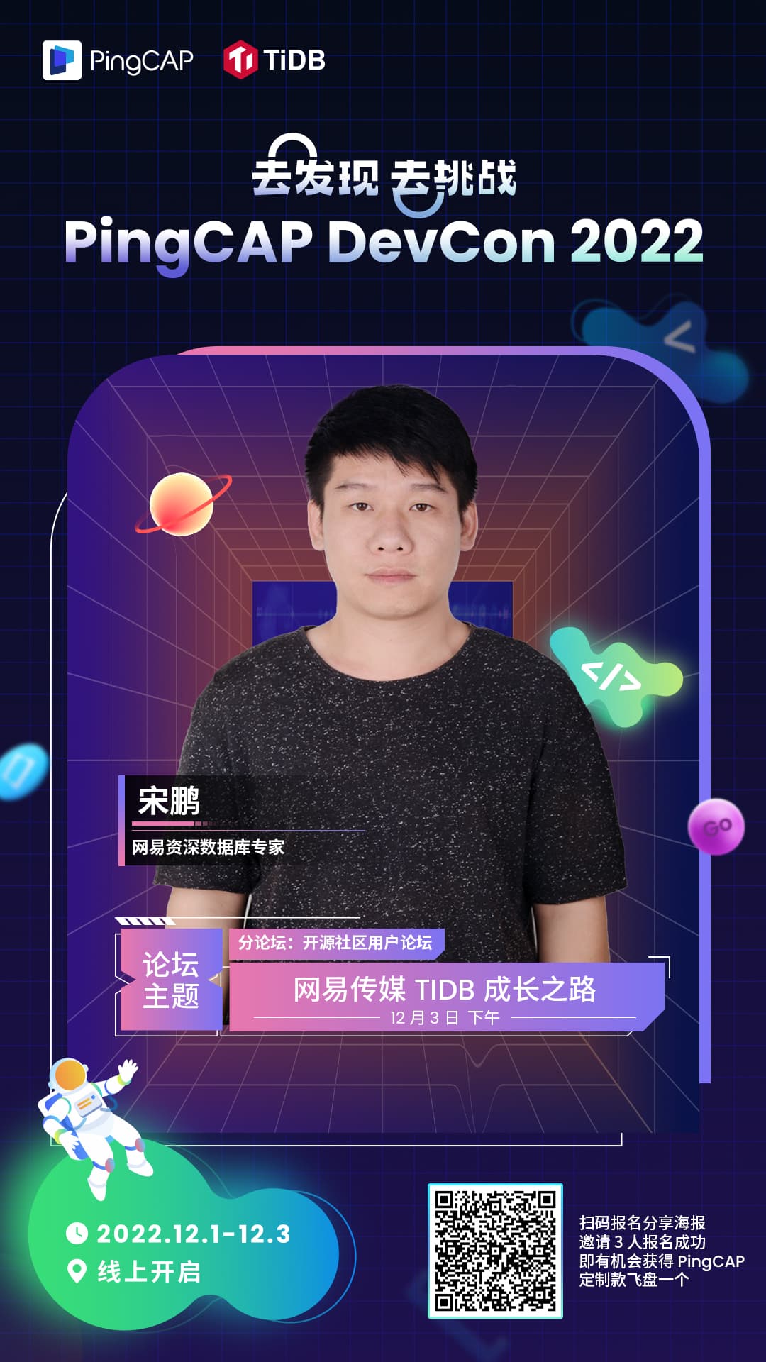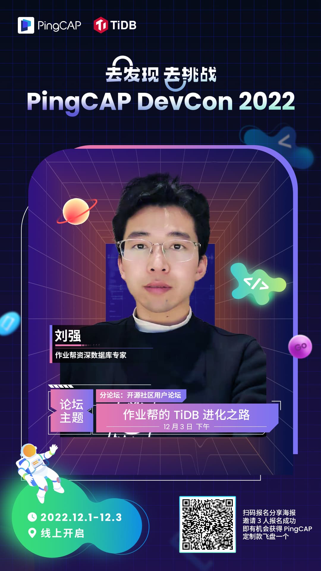 PingCAP 全球社区生态负责人——姚维,加入 PingCAP 以前在奇虎 360 基础架构组负责开源 MySQL 中间件 Atlas, MySQL 网络包嗅探器 MySQL-sniffer, 12 年创业做过安卓推送系统聚能推。