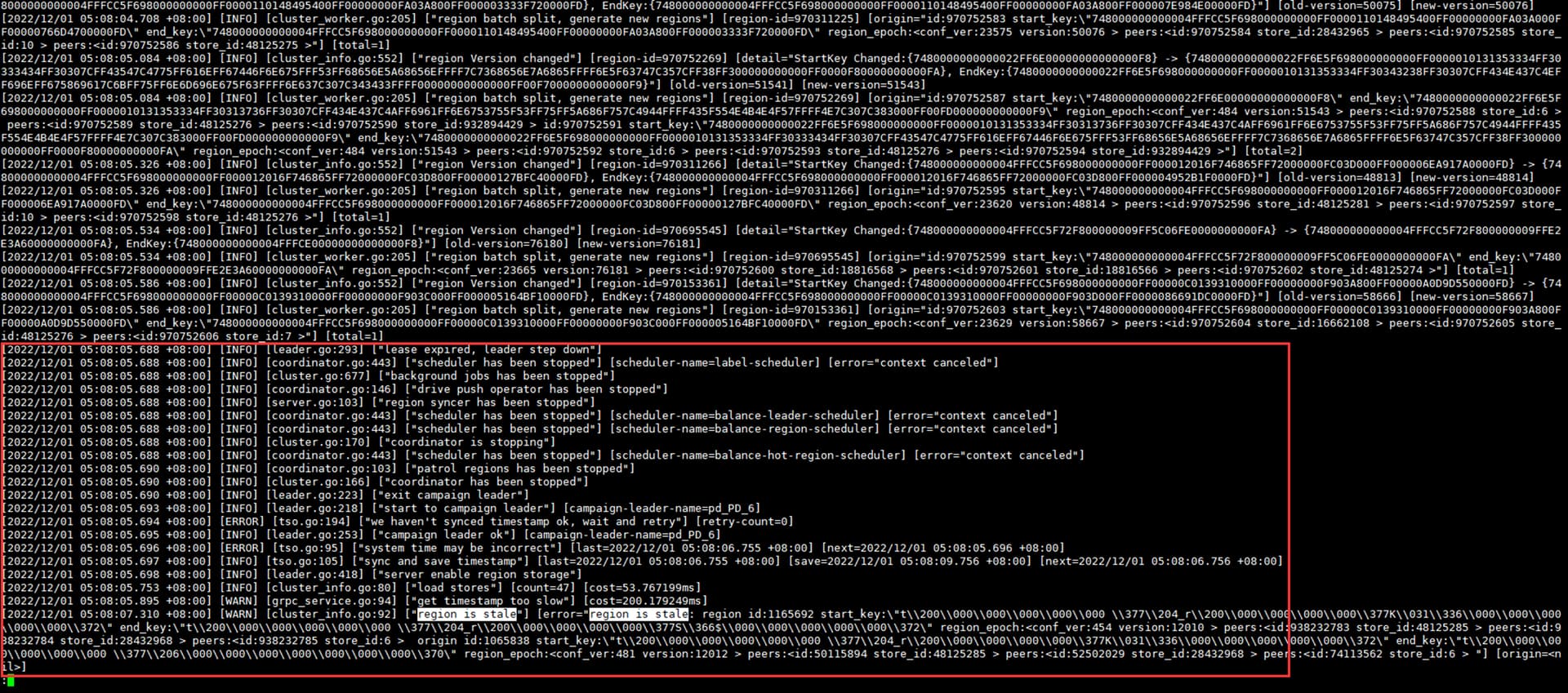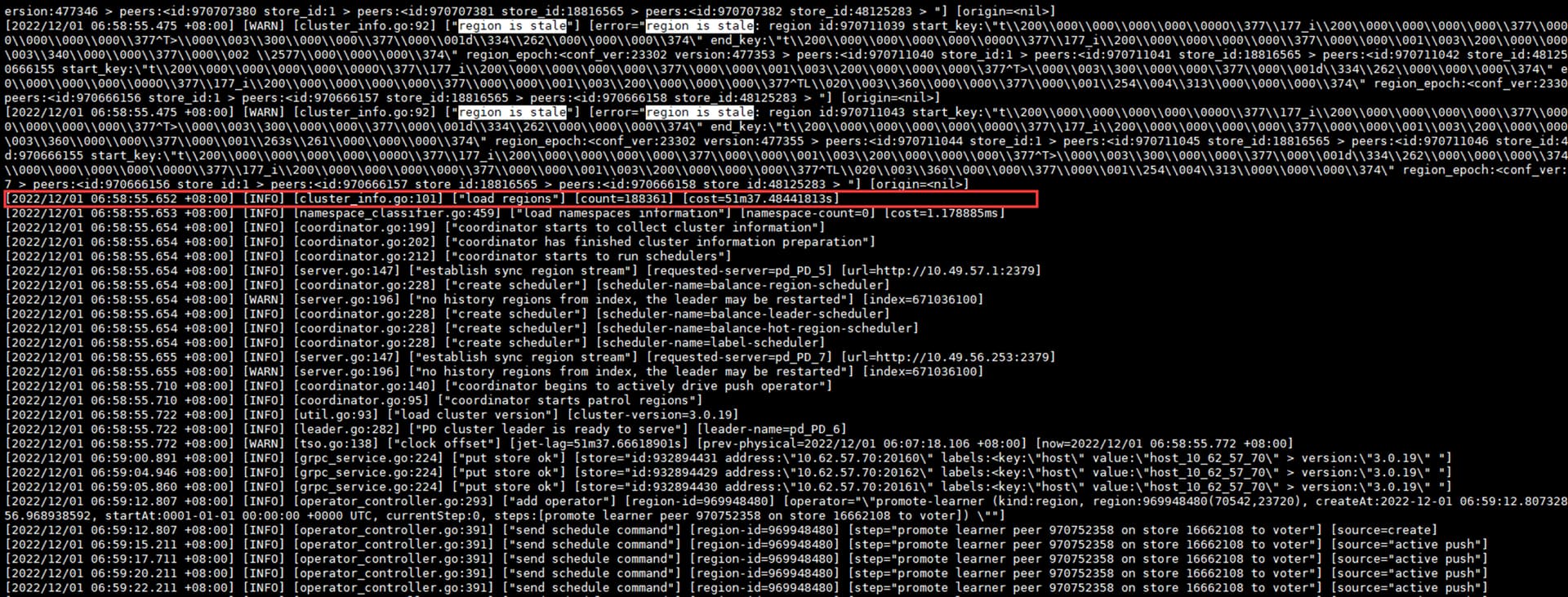 之后尝试进行版本升级,重启pd过程中依然会出现长时间的load region导致重启pd失败,目前只能等load完毕后再次尝试一下,集群处于不可用状态。