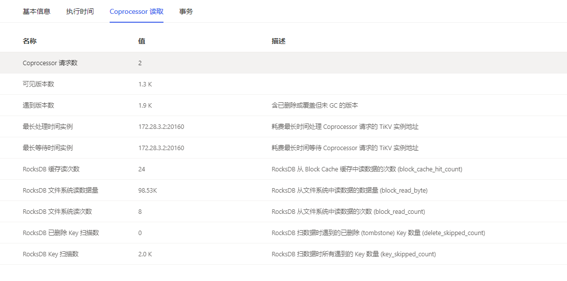 | └─TableRowIDScan_12 | cop[tikv] | 460 | table:stat_day_longteng, keep order:false | 649 | time:5.61ms, loops:2, cop_task: {num: 1, max: 5.34ms, proc_keys: 649, tot_proc: 4ms, rpc_num: 1, rpc_time: 5.32ms, copr_cache_hit_ratio: 0.00}, tikv_task:{time:2ms, loops:5}, scan_detail: {total_process_keys: 649, total_process_keys_size: 179080, total_keys: 1299, rocksdb: {delete_skipped_count: 0, key_skipped_count: 1386, block: {cache_hit_count: 15, read_count: 6, read_byte: 57.1 KB}}} | N/A | N/A |
