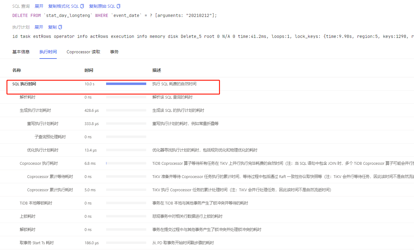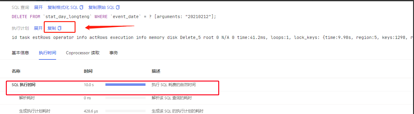 把执行计划复制进来看看,还有后面两个tab 中的内容(cop 读取和事务),也截个图看看
