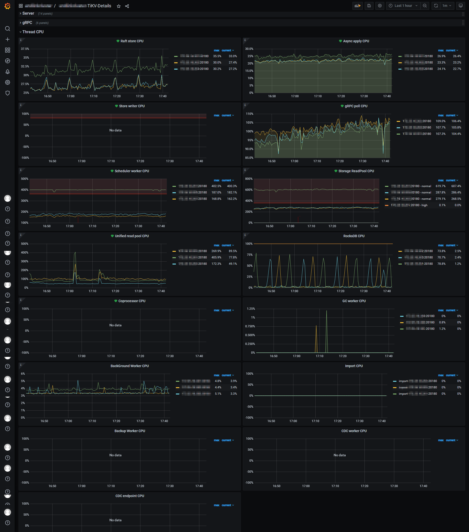 看下tikv CPU利用率、tikv磁盘性能、black_exporter中的网络延迟情况