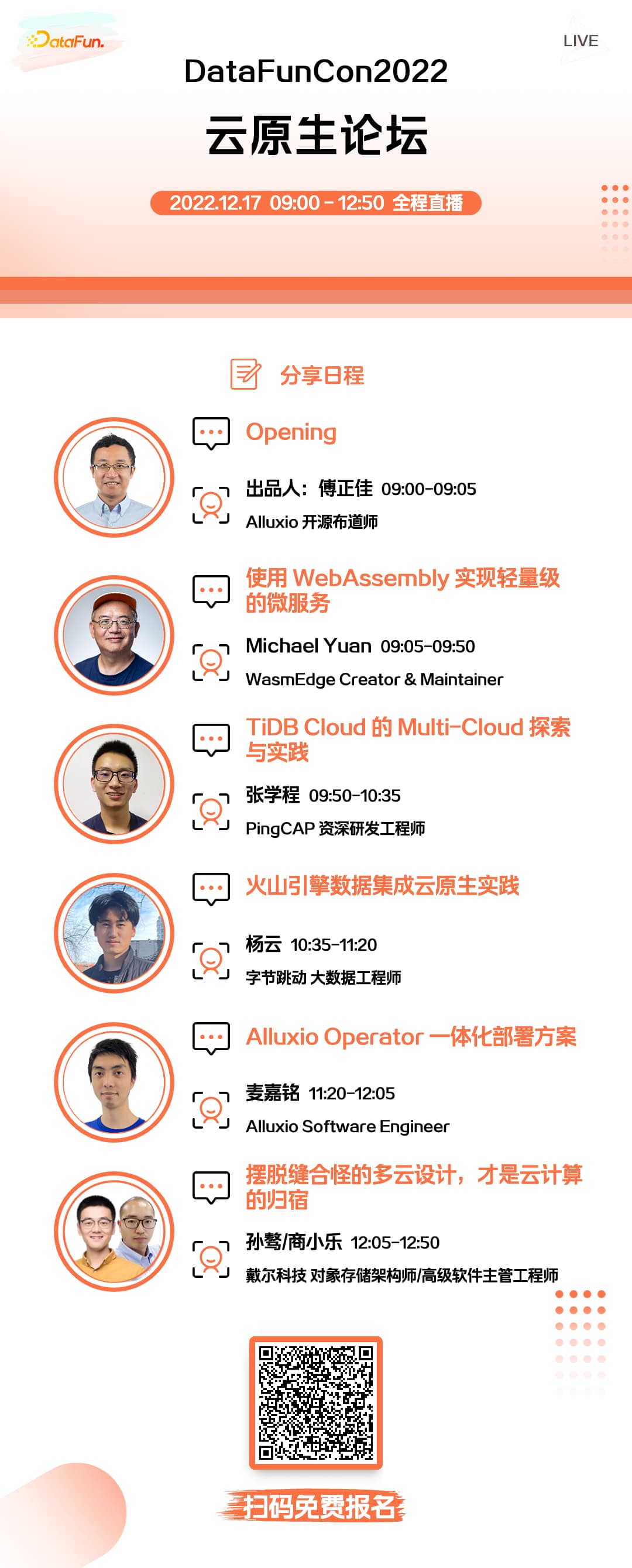 12月17-18日,09:00-12:50,在DataFunCon2022将设立云原生论坛。云原生作为云计算的技术内核在众多行业已得到深入应用和广泛认可,以容器及其编排技术、Serverless等为代表的云原生技术正成为新一代云计算的发展热点。此外,开源作为当前大量基础软件产品的开发、维护和推广方式,也深刻影响着分布式云原生系统软件的迭代演进。此次的云原生分论坛邀请到来自戴尔、Alluxio、Second State、TiDB和字节跳动的专家共聚一堂,将围绕K8s、云原生计算、数据库、存储等主题,为大家分享最新的发展趋势、技术创新、应用场景和落地方案。
