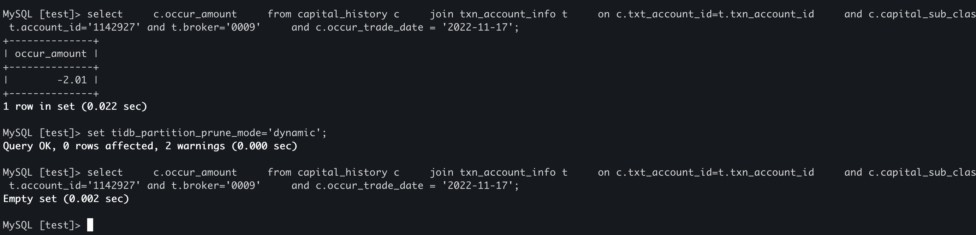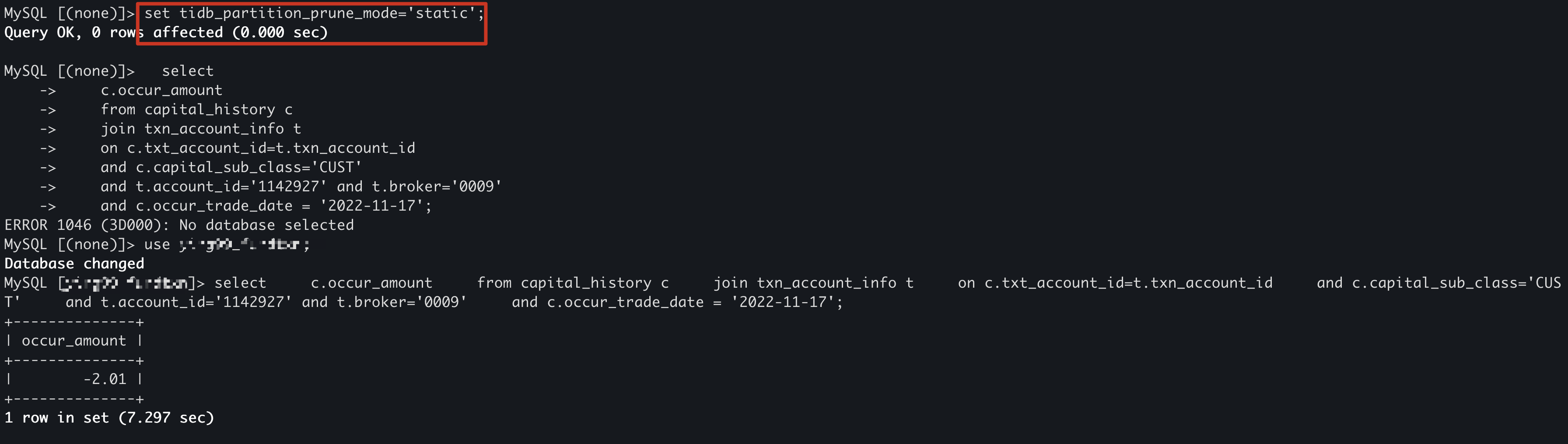 TiDB root@10.18.13.224:test> show variables like '%tidb_partition_prune_mode%'